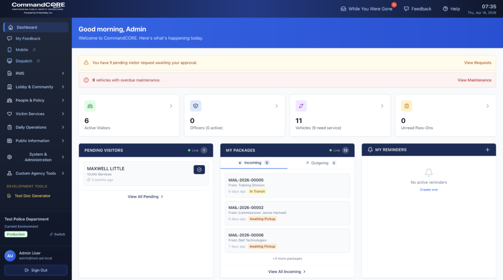 Our flagship platform, CommandCORE, digitizes everything that happens inside an agency that isn’t dispatch-related. From policy acknowledgments and visitor check-ins to vehicle management, retention scheduling, and auditing.